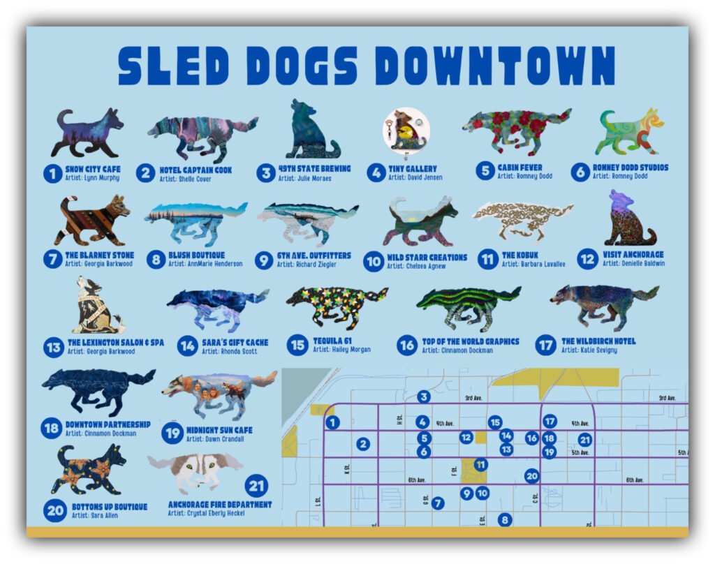 Artist Rhonda Scott stands with one of her painted sled dog sculptures created for the Anchorage Mushing District auction supporting the Anchorage Mushing District.