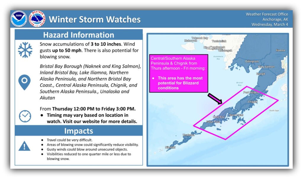 The National Weather Service Anchorage Alaska has issued Winter Storm Watches for Bristol Bay, the Alaska Peninsula, Akutan, and Unalaska from Thursday at noon through Friday at 3 p.m.