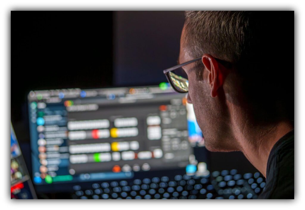 A cybersecurity professional analyzes data across multiple screens in a low-light workspace during a network security assessment. Photo illustration.