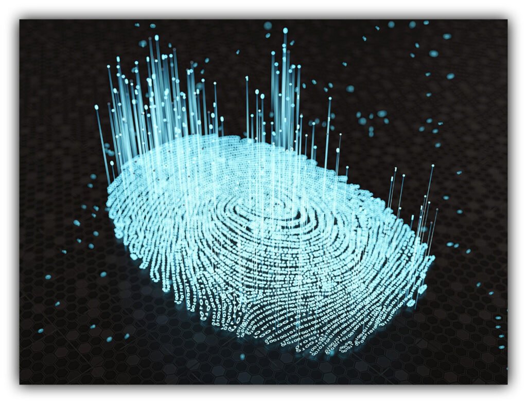 A biometric fingerprint and binary code illustrate digital identity tracking used in cyber investigations. Photo illustration.