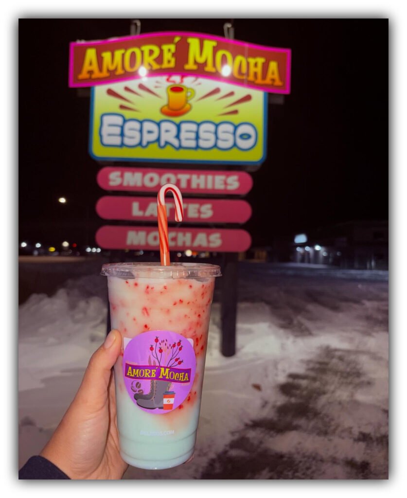 A festive seasonal coffee at Amore Mocha Coffee Shop, with the shop’s sign visible in the background that was recently struck in a hit-and-run.