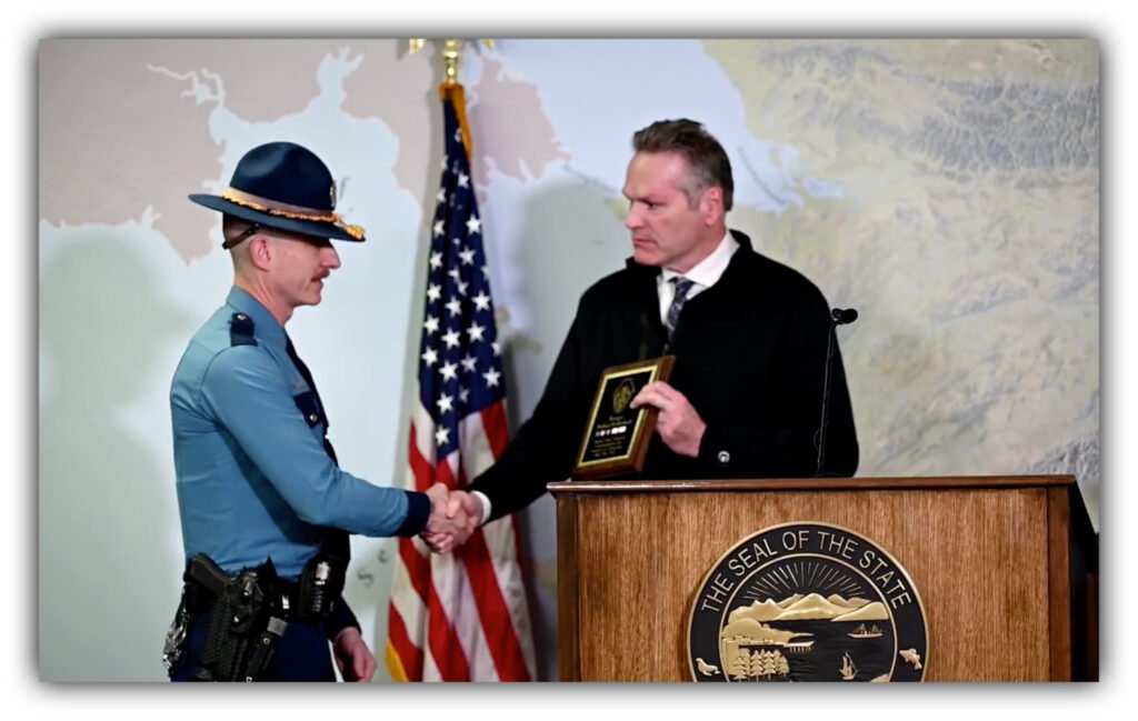 Gov. Mike Dunleavy presents Trooper Garrett Stevens with the Bravery and Life Saving Award for his heroic rescue of a child from Cloudy Lake. | Source: Gov. Mike Dunleavy
