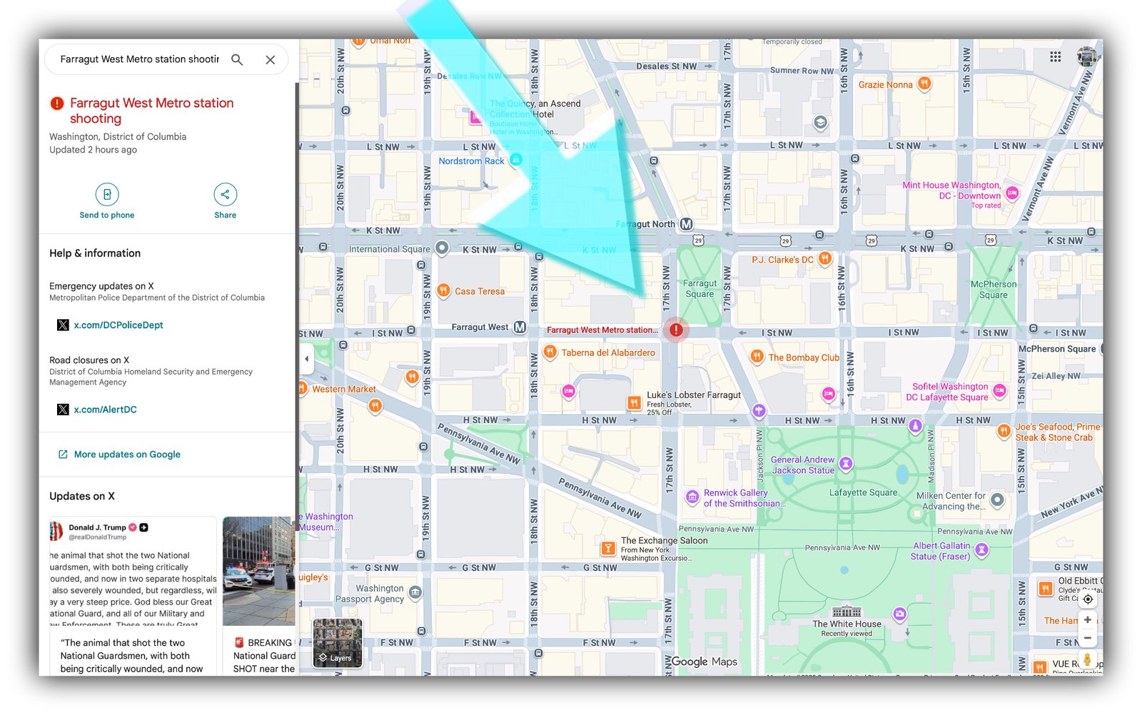 Map showing the location of today’s shooting in Washington, D.C., at the intersection of 17th Street and I Street NW, near Farragut Square Park and the Farragut West Metro station, just a few blocks from the White House. The incident occurred Wednesday, November 26, 2025.
