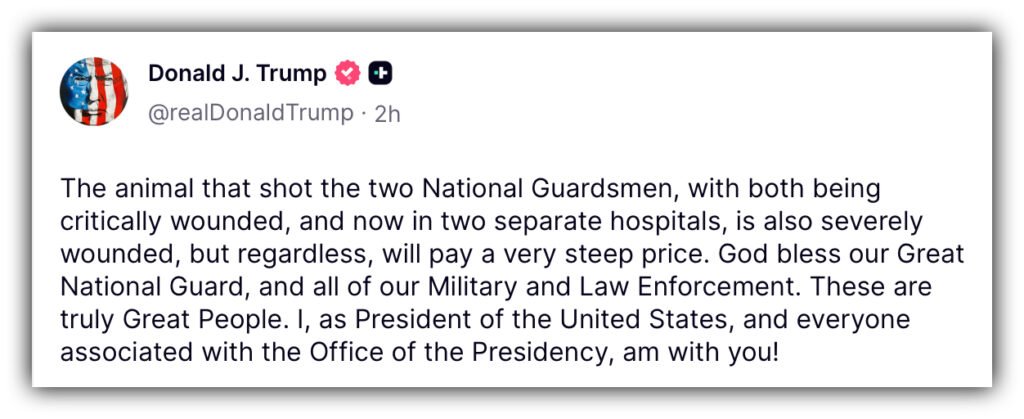 “The animal that shot the two National Guardsmen, with both being critically wounded, and now in two separate hospitals, is also severely wounded, but regardless, will pay a very steep price,” the President wrote. “God bless our Great National Guard, and all of our Military and Law Enforcement. These are truly Great People. I, as President of the United States, and everyone associated with the Office of the Presidency, am with you!” Link to post.