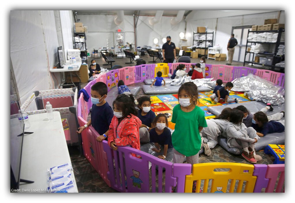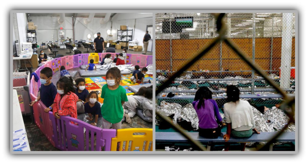 Children sit on benches behind chain-link fencing as dozens of immigrant kids lie on thin mats under reflective Mylar blankets inside a crowded Border Patrol detention facility, courtesy ACLU.