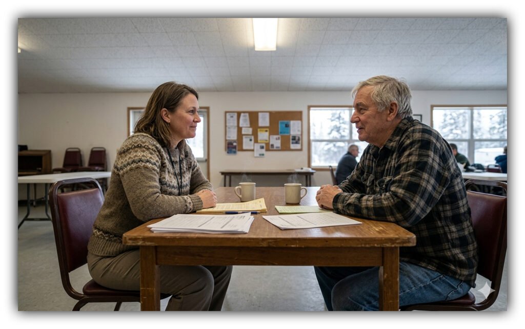 A lawyer, credit counselor, or advocate meets calmly with a client across a simple table piled with paperwork and a cup of coffee. This is what early help can look like before bankruptcy becomes the only option—quiet, practical, and focused on options rather than stigma. | Alaska Headline Living ©